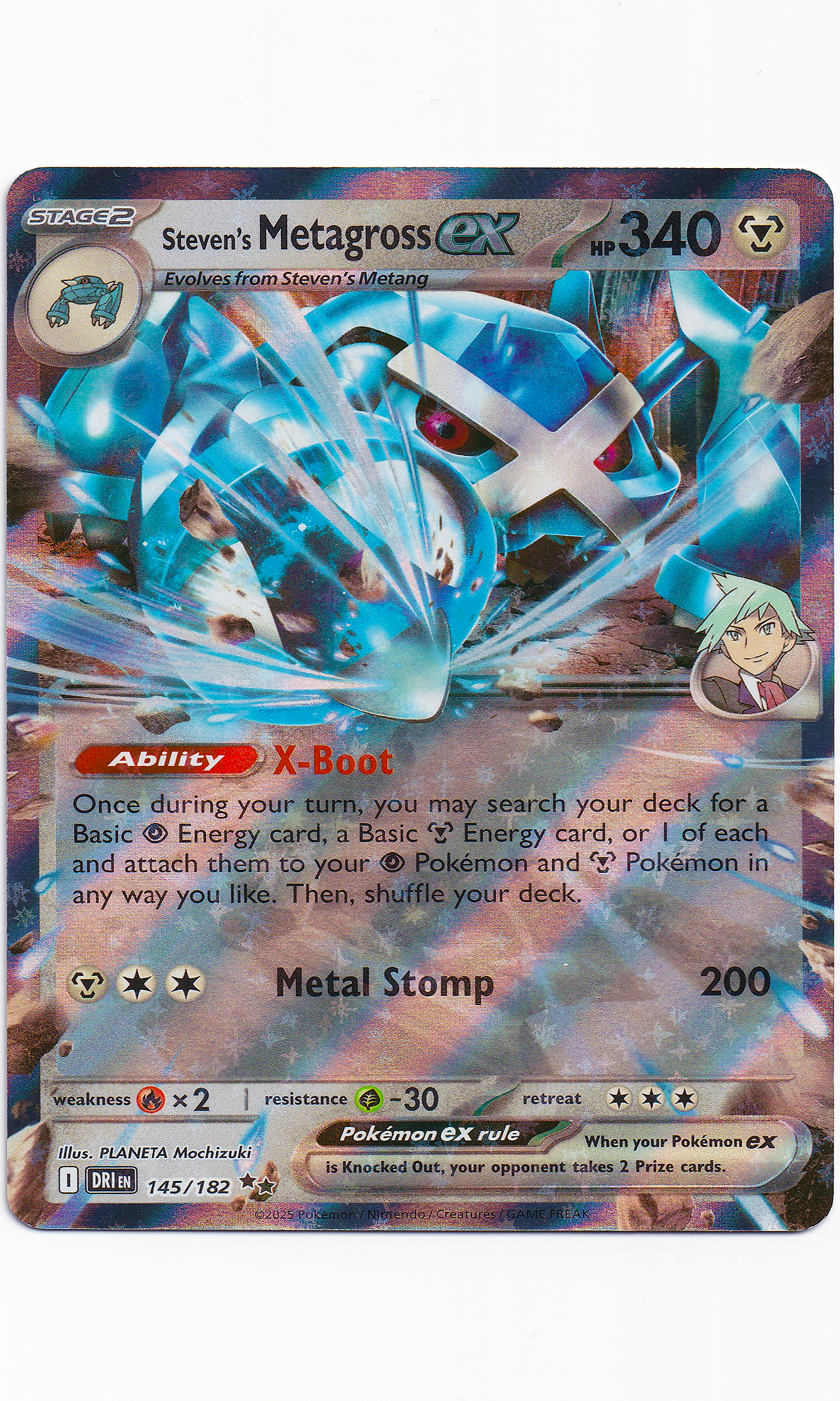 Add this powerful Steven's Metagross EX to your collection! Card #145 from the Destined Rivals set features this Double Rare Pokémon with impressive artwork and battle capabilities. A must-have for serious trainers and collectors looking to dominate their next match or complete their Pokémon TCG series.